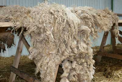 De afgeschoren vacht van het schaap valt los uit elkaar. Meestal zitten er ook takjes en grassprieten en schapenpoep in.